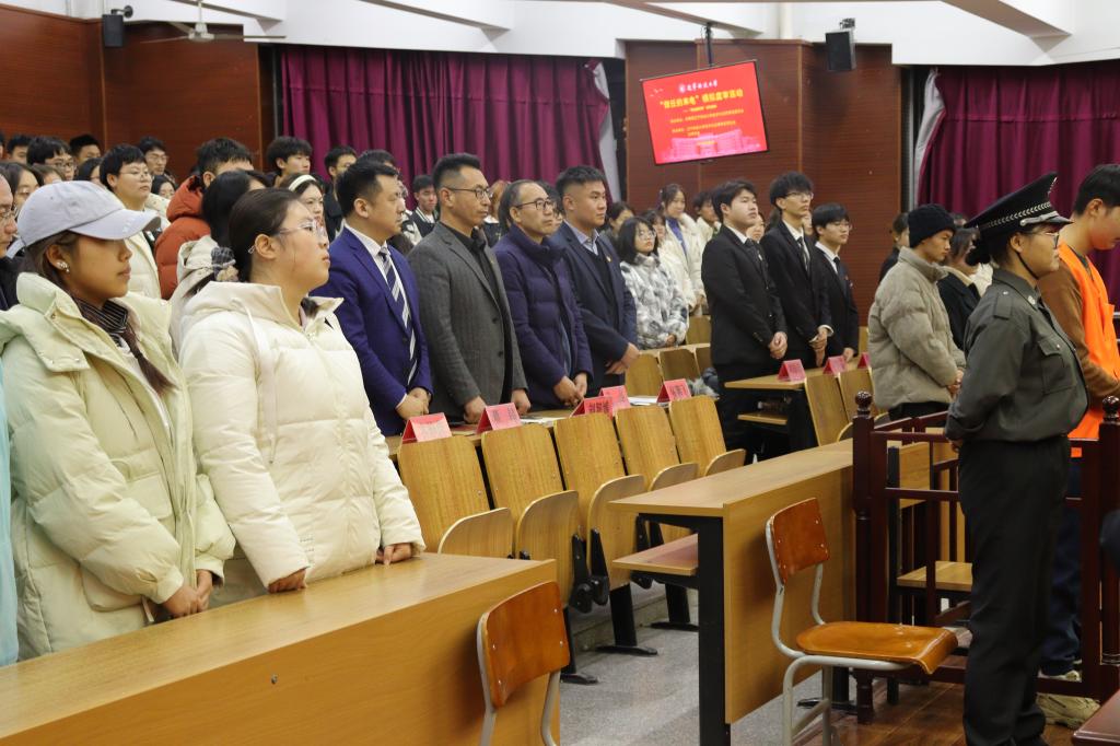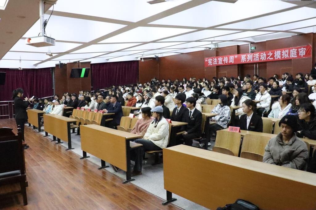 在国家宪法日到来之际,12月3日,经法学院于明德楼A213开展“宪法宣传周”系列活动之“信任的来电”模拟庭审。本次活动由金融24-2班张馨文主持,经法学院相关领导、教师代表、校院团学骨干代表及来自各学院的200余名学生参加了本次活动。