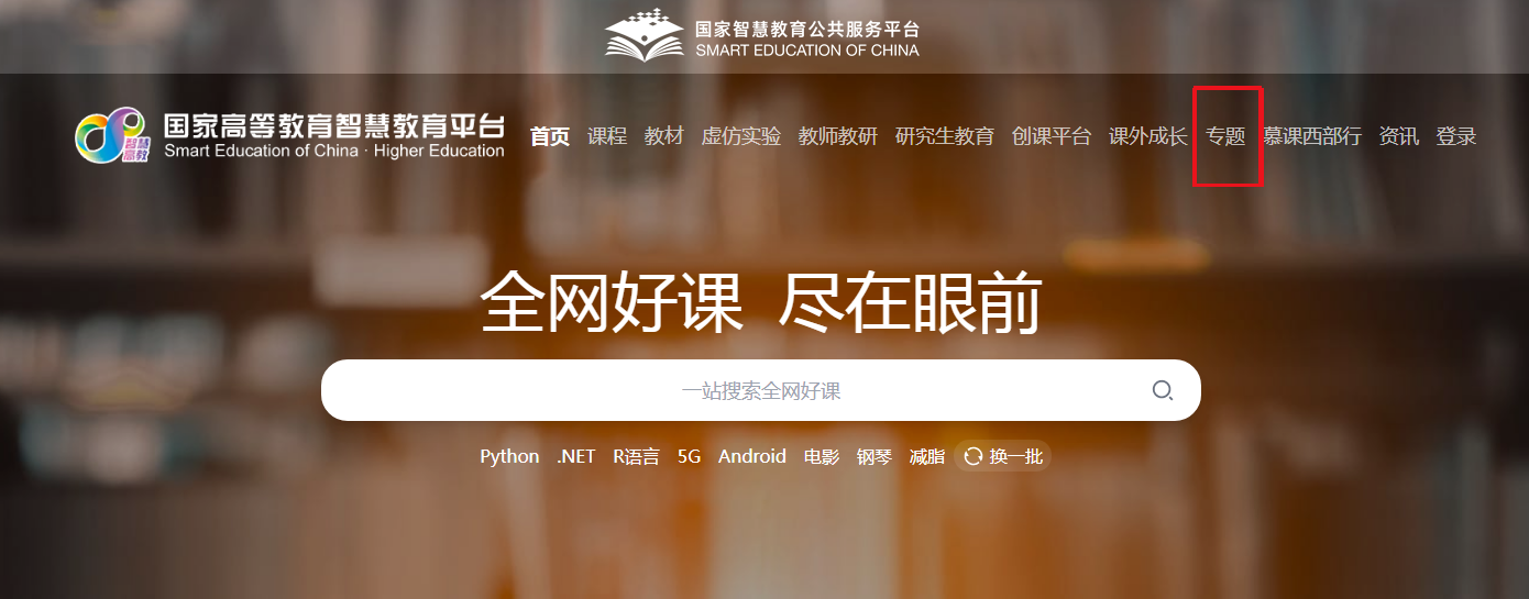 第一步,登录国家高等教育智慧教育平台,并点击“专题”,地址为:https://higher.smartedu.cn///higher.smartedu.cn/,或通过学校教务处主页跳转链接。