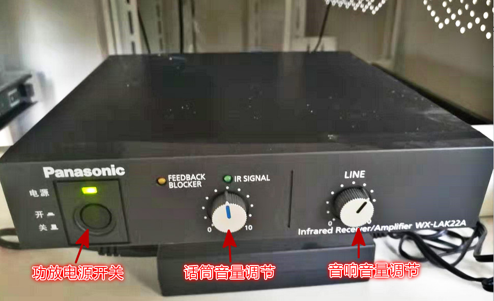 目前我校所有多媒体教室均已安装松下红外无线扩音系统,该系统无需对频,开机即可使用,而且采用红外线传输,无电磁波辐射。原来安装的2.4G扩声系统不再使用。