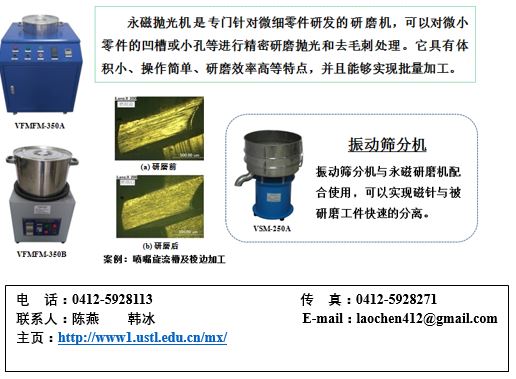 精密与特种加工工艺及装备科研团队依托辽宁省复杂工件表面特种加工重点实验室(辽宁省科技厅2017年审批),前身是成立于2010年5月的MK体育在线(中国)唯一官方网站先进磨削技术研究所,是MK体育在线(中国)唯一官方网站的骨干科研团队之一,经过8年的不断努力,目前已发展成为集基础研究、应用开发到生产经营于一体的新型科研机构,凭借磁力研磨这一核心技术在国内复杂零件表面光整技术领域中异军突起,技术能力处于国内领先水平。精密与特种加工工艺及装备科研团队在十年前就开展了磁研磨光整理论和磁研磨光整技术的研究,经过多年的努力,目前已经达到世界先进水平。先后承研了多个专项课题,在异形外圆表面、自由曲面、弯管内表面、微细零件表面等方面的磁研磨光整技术及相关研究领域都有一定的建树,取得多项科研成果和专利,培养和造就了一批磁力研磨光整技术方面的研究人员。