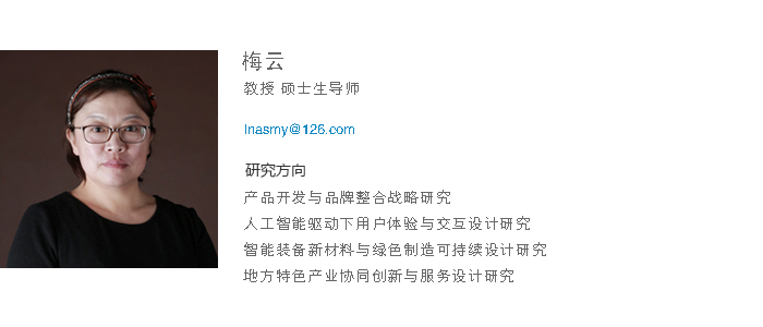 梅云教授,鲁迅美术学院艺术硕士。具有丰富的理论教学及设计实践经验,先后主讲工业设计多门全体系课程,主讲本科核心课程《产品开发设计》、《产品设计 3》、《造型材料与工艺》、《品牌 VI 设计》、《设计战略与市场营销》等。研究生教学先后主讲《设计研究课题 1》、《设计研究课题 2》、《品牌战略研究》等课程。指导研究生多次荣获国家级奖学金及校级优秀研究生。主持辽宁省教育厅科研基金项目 2 项、辽宁省资源共享课建设 1 门、鞍山市科技项目 1 项、参与国家“863 ”项目 1 项。作为项目负责人与省内外多个上市企业公司及政府事业单位开展多方面项目合作,完成十余项横向项目,项目经费总计超过 150 余万元。出版专著 2 部,校级优秀教材 1 部;在国内外期刊公开发表学术论文 30 余篇, 申请实用新型专利 3 项,外观设计专利4 项。指导学生荣获国家级、省级专业设计奖项近百项,其中国家级一等奖及辽宁省创新创业大赛一等奖十余项,省级挑战杯银奖等。荣获MK体育在线(中国)唯一官方网站优秀创业能手;MK体育在线(中国)唯一官方网站毕业设计优秀指导教师;辽宁省工业设计大赛优秀指导教师;辽宁省自然科学学术成果二等奖;鞍山市科学学术成果奖一等奖。中国工业设计协会个人理事,辽宁省工业设计协会理事;四川省工业设计大赛评委,辽宁省三维设计大赛评委;国家级某知网检索期刊杂志编委。AEIC学术交流中心材料机械系列会议组委员会专家组成员。