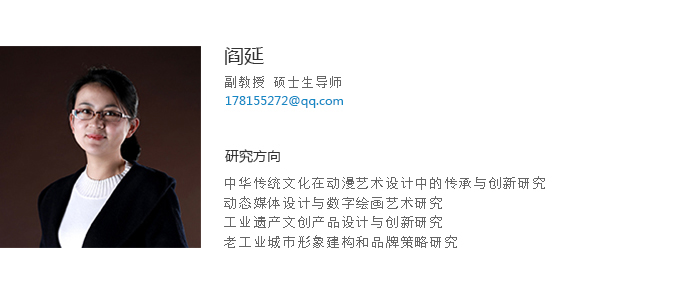 阎延副教授,鲁迅美术学院视觉传达专业硕士毕业。具有十多年的数字动画设计和新媒体设计的教学经验和项目实践经验。多年来在国内外学术期刊中发表作品及论文二十余篇,多次参与辽宁省教育科学“十二五”规划系列教材编写工作。近年来主持动画专业设计类系列课程的教学体系创新研究与实践项目,主持辽宁省社会科学规划基金项目;设计制作的《数字动画》、《动漫周边设计》和《用户界面设计》等课程多媒体交互课件,荣获教育部颁发的全国多媒体课件大赛二、三等奖。数字插画类作品曾多次获得全国美育成果展一等奖;数字文创设计作品荣获第13届未来设计师NCDA大赛省赛一等奖。近几年间指导学生参加全国高校数字艺术设计大赛、中国大学生广告艺术节学院奖、辽宁省大学生新媒体设计竞赛等多个专业比赛,并获得国赛和省赛佳绩;多年来曾多次获得优秀毕业设计指导教师。