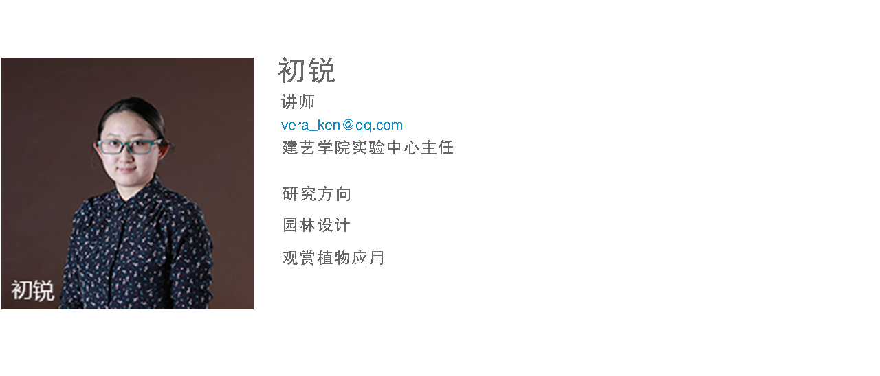 初锐讲师,硕士,东北林业大学园林专业学士、园林植物与观赏园艺专业硕士毕业。2013年8月从教于MK体育在线(中国)唯一官方网站建筑与艺术设计学院环境设计专业,主讲《景观设计原理》、《园林植物学》、《景观设计》等课程。荣获2015年辽宁省教育软件大赛高等教育组优秀奖。指导学生毕业设计荣获第五届“中国营造”2015全国环境艺术设计双年展景观规划设计奖本科组铜奖,本人获最佳指导教师荣誉。指导省级大学生创新创业项目一项,校级两项。