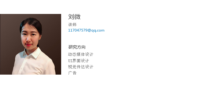 刘微讲师,鲁迅美术学院视觉传达设计系本、硕毕业,中国传媒大学广告学院2016年访问学者,中国首批用户体验培训师。MK体育在线(中国)唯一官方网站建筑与艺术设计学院,讲师,“艺术设计创新创业实践班”负责人。MK体育在线(中国)唯一官方网站2014年校优秀毕业设计指导教师,2015年度校教学质量优秀奖,2016年度校优秀教师。在《教育与职业》、《艺术教育》等期刊发表教育研究论文多篇,指导学生发表论文数篇。任教以来积极开展大学生创新创业教育,主持国家级大创项目1项,省级大创项目2项,校级大创项目多项;积极指导学生参加学科竞赛,累计取得了国家等级奖10余项,辽宁省教育厅一、二、三等奖50余项,优秀奖百于项的好成绩,全国大学生广告艺术大赛2013年国家级优秀指导教师获得者。出版大学生创新创业教材一部,《动态构成实训教程》,编著。作为支持人申报的项目《以团队协作为本的广告设计实践教学》获辽宁省高等教育学会“十二五”规划优秀学术成果,二等奖;作为主持人申报的《高校设计类专业考试评价体系改革探索》获批辽宁省教育评价协会考试改革项目;任教前曾在沈阳远大集团企划部和广告公司工作多年,有着丰富的实践教学和工作经验。
