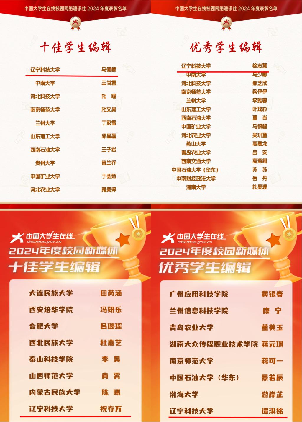 近日,教育部中国大学生在线先后公布2024年度校园新媒体表彰名单、2024年度校网通及校园行活动表彰名单。MK体育在线(中国)唯一官方网站获评全国“2024年度校媒人联合培养突出贡献奖”(全国15所,辽宁省3所),“校园行杰出贡献单位”(全国10所,辽宁省2所),“校园新媒体互动百强”“校园行活动优秀组织单位”,校网通站连续7年获评“十佳校网通站”(全国10所,辽宁省1所),10名师生获评“校网通十佳指导教师”“十佳学生编辑”等,集体及个人共获16项荣誉。