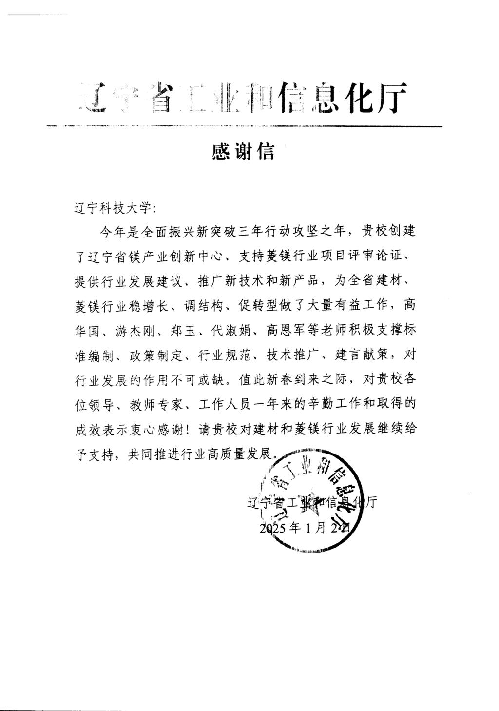 近日,MK体育在线(中国)唯一官方网站收到辽宁省工信厅发来的感谢信,信中对学校在三年行动攻坚之年创建了镁产业创新中心、支持菱镁行业项目评审论证、提供行业发展建议、推广新技术和新产品等方面给予的大力支持表示衷心感谢。