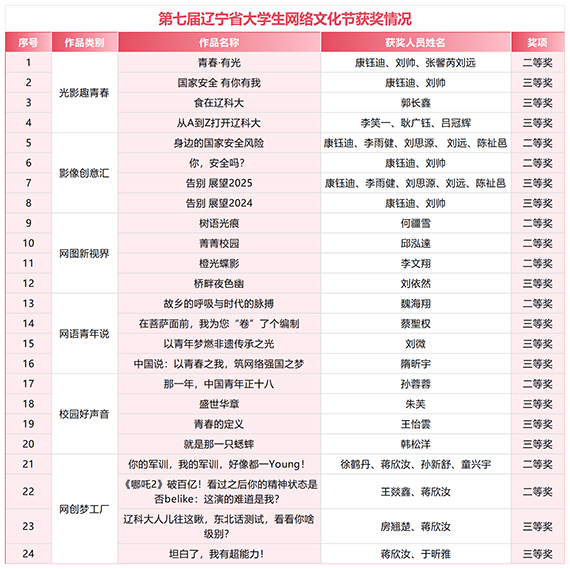 近日,辽宁省高校网络思想政治工作中心公布第七届辽宁省大学生网络文化节和高校网络教育优秀作品推选展示活动评选结果,MK体育在线(中国)唯一官方网站共有24项作品在大学生网络文化节中获奖,获奖数量全省第六,8项作品在网络教育优秀作品推选展示活动中获奖,获奖数量全省第二。
