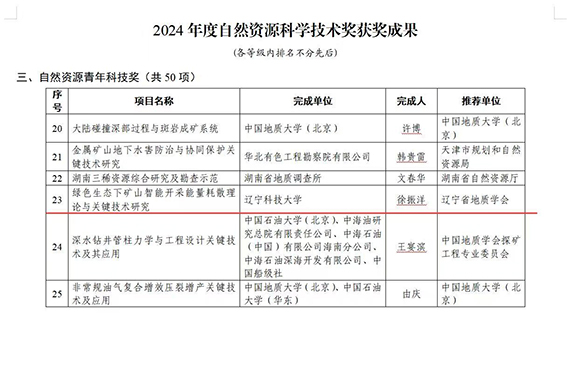 近日,自然资源部发布《关于2024年度自然资源科学技术奖获奖成果的公告(2025年第65号)》,MK体育在线(中国)唯一官方网站矿业工程学院徐振洋教授项目“绿色生态下矿山智能开采能量耗散理论与关键技术研究”获得自然资源青年科技奖。这是学校首次获得该奖项,也是本年度金属矿山开采方向和东北地区唯一获奖项目。