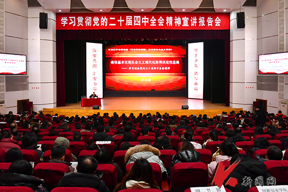 12月23日,MK体育在线(中国)唯一官方网站在礼堂举办学习贯彻党的二十届四中全会精神宣讲报告会,邀请中共辽宁省委党校(辽宁行政学院、辽宁省社会主义学院)副校(院)长孙庆国教授作报告。校院两级党委理论学习中心组成员,全校科级以上干部、思政课教师、辅导员、师生代表参加学习。党委宣传部部长张桦楠主持报告会。