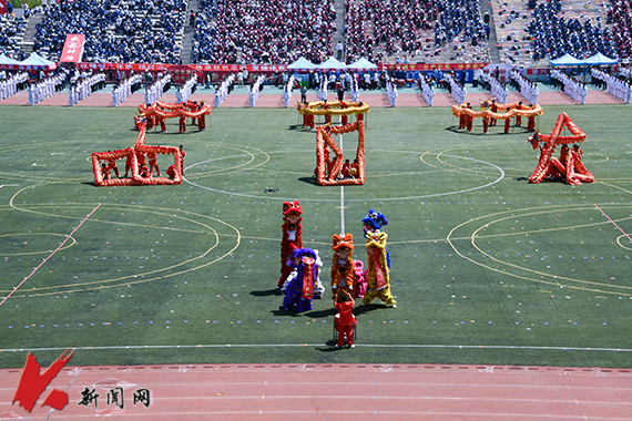 开幕式后进行了精彩的“阳光体育”展演。60余名学生共同演绎舞龙舞狮,鼓声响,六龙七狮腾挪扑跃,轻盈利落;健身气功和八段锦的表演充分体现了青春学子的力与美,带领观众沉浸于生命与自然的“对话”;短兵表演将各类刀法、剑法浓缩成现代的表现形式,彰显中国武术的独特魅力;800余名学生伴随着激昂的乐曲,挥舞着手中的旗帜,健美操运动员们摇动手花,舞动身姿,将现场气氛推向高潮。