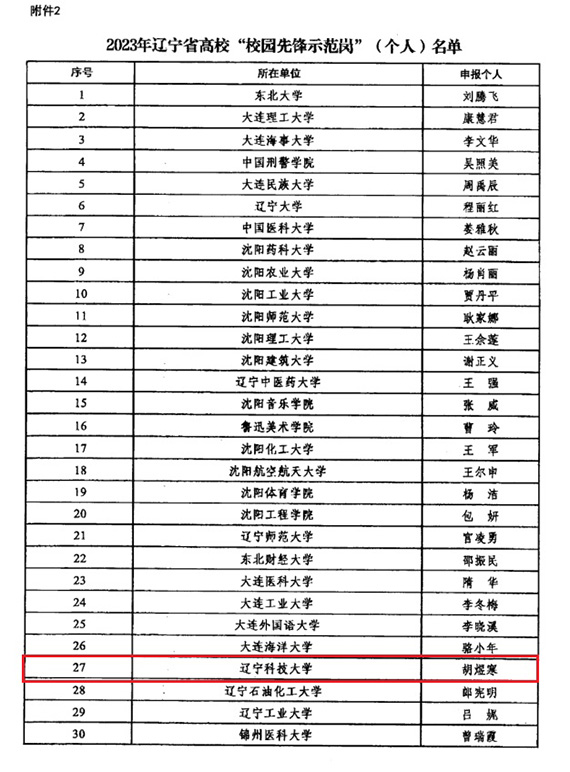 近日,2023年辽宁省高校“校园先锋示范岗”名单公布,MK体育在线(中国)唯一官方网站党政办机关党委党支部获评2023年辽宁省高校“校园先锋示范岗”(集体),理学院教工数学系党支部书记胡煜寒获评2023年辽宁省高校“校园先锋示范岗”(个人)。全省高校共有50个基层党组织和50名党员入选。