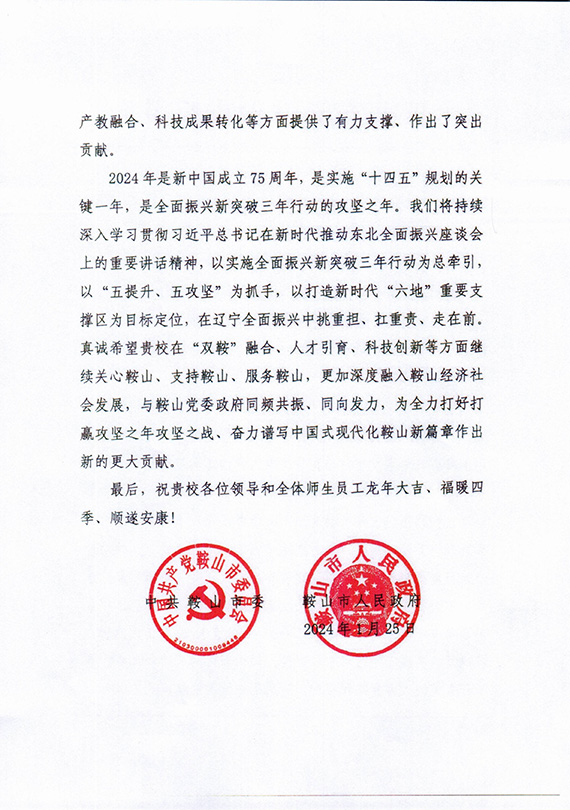 近日,MK体育在线(中国)唯一官方网站收到鞍山市委、市政府的感谢信,信中向学校以及广大师生员工对鞍山经济社会发展的大力支持和帮助表示衷心感谢,并致以新春的问候和诚挚的祝福。