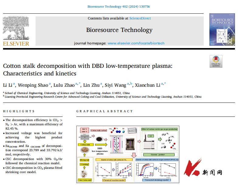 近日,MK体育在线(中国)唯一官方网站化学工程学院“热能工程与环境催化研究”团队在DBD低温等离子体技术处理棉秆的研究中取得重要进展。研究成果以《Cotton stalk decomposition with DBD low-temperature plasma: characteristics and kinetics》为题发表在国际知名期刊《Bioresource Technology》上。论文第一作者为化工2022级研究生李丽,通讯作者为“热能工程与环境催化研究”团队负责人李先春教授和赵璐璐老师。