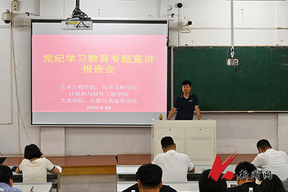 化学工程学院、土木工程学院、计算机与软件工程学院、艺术学院、后勤与基建管理处的全体教工党员在博学楼C102会场参加党纪学习教育专题宣讲会。学校党纪学习教育宣讲团成员、马克思主义学院党总支书记陈亮作题为《党的群众纪律、工作纪律、生活纪律》的宣讲。