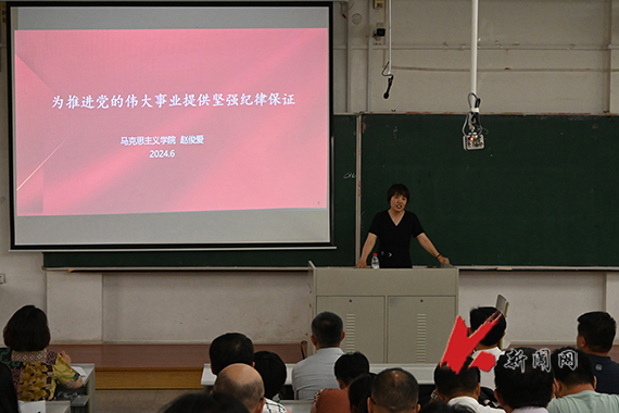 电子与信息工程学院、外国语学院、马克思主义学院、创新创业学院和图书馆的全体教工党员在明德楼A201会场参加了党纪学习教育专题宣讲报告会。学校党纪学习教育宣讲团成员、马克思主义学院教师赵俊爱作了题为《为推进党的伟大事业提供坚强纪律保证》的主题宣讲。
