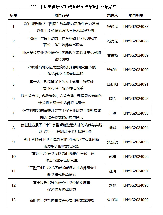 近日,从辽宁省教育厅学位管理与研究生教育处发布的《关于确定2024年度辽宁省研究生教育教学改革研究项目立项的通知》中获悉,MK体育在线(中国)唯一官方网站获批13项研究生教育教学改革研究项目,获批项目涵盖多个学科领域和研究方向。