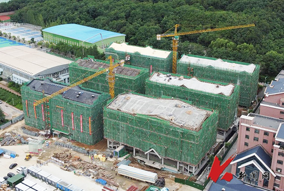 新建学生宿舍及食堂项目共包括五栋学生宿舍楼(5#、6#、7#、8#、9#)及一栋食堂(4#学生食堂),总建筑面积34606.4平方米,其中地上建筑面积29819.23平方米,地下建筑面积4787.17平方米(含地下人防工程建筑面积2332.3平方米)。随着主体结构的封顶,项目将进入装修、设备安装等后续施工阶段。