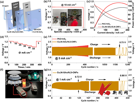 据了解,此研究的亮点在于由静电纺丝技术制备出了具有独特空间结构的S,N共掺杂碳纳米纤维膜电极,并在其中实现了Co和Ni的原子级分散。这种富含单原子催化活性位点的膜电极不仅提高了电极材料的活性位点利用率,还优化了含氧中间体的吸附能,从而显著提升了电催化氧反应性能。独立柔性自支撑膜电极的成功合成亦有效抑制电极在充放电过程中的结构变化,从而提高电池的循环稳定性。为了在无损伤前提下探究这种新型膜电极对氧还原反应(ORR)和氧析出反应(OER)的催化活性,探究不同工作温度下膜电极表面的氧反应活性分布,研究团队采用了自主研发的温控扫描电化学显微镜(SECM)技术。SECM作为一种高分辨率的电化学原位测量技术,能够实现对电极表面局部电化学活性的实时监测与分析。使用该自支撑膜电极构筑的固态和液态锌空气电池均表现出优异的放电峰值功率密度、能量密度以及充放电循环寿命。