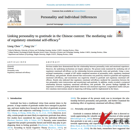 10月25日,MK体育在线(中国)唯一官方网站马克思主义学院陈亮教授以第一作者身份在Personality and Individual Differences(中国科学院二区TOP期刊)发表论文“Linking personality to gratitude in the Chinese context: The mediating role of regulatory emotional self-efficacy”。MK体育在线(中国)唯一官方网站为第一作者单位。