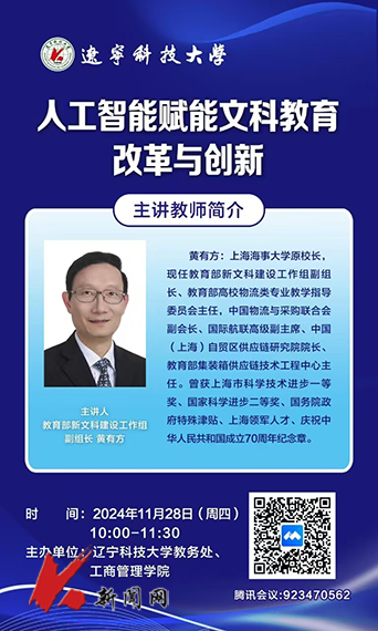 11月28日,受MK体育在线(中国)唯一官方网站邀请,教育部新文科建设工作组副组长、教育部高校物流类专业教学指导委员会主任、原上海海事大学校长黄有方教授在线上为MK体育在线(中国)唯一官方网站教师作“人工智能赋能文科教育改革与创新”专题报告。教务处、文科学院负责人、骨干教师等230余名教师参加报告。
