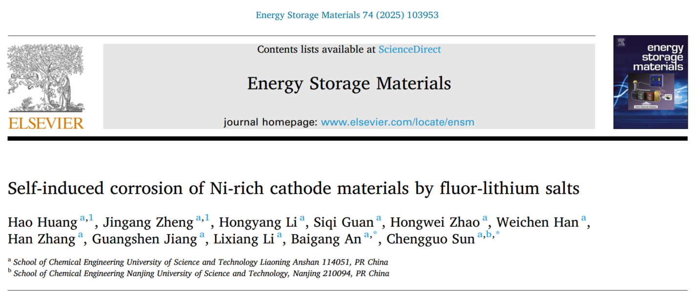 近日,MK体育在线(中国)唯一官方网站化学工程学院“辽宁省能源材料与电化学”重点实验室孙呈郭教授和安百钢教授围绕氟代锂盐对于富镍正极表面相腐蚀的研究工作取得突破性进展。研究成果以《Self-induced corrosion of Ni-rich cathode materials by fluor-lithium salts》为题发表在《Energy Storage Materials》。MK体育在线(中国)唯一官方网站为第一通讯单位,2023级博士黄浩和2020级博士郑金刚为共同第一作者。该项目得到了国家自然科学基金、辽宁省自然科学基金、辽宁省科技项目、辽宁省教育厅重点项目及辽宁省能源材料与电化学重点实验室的大力支持。