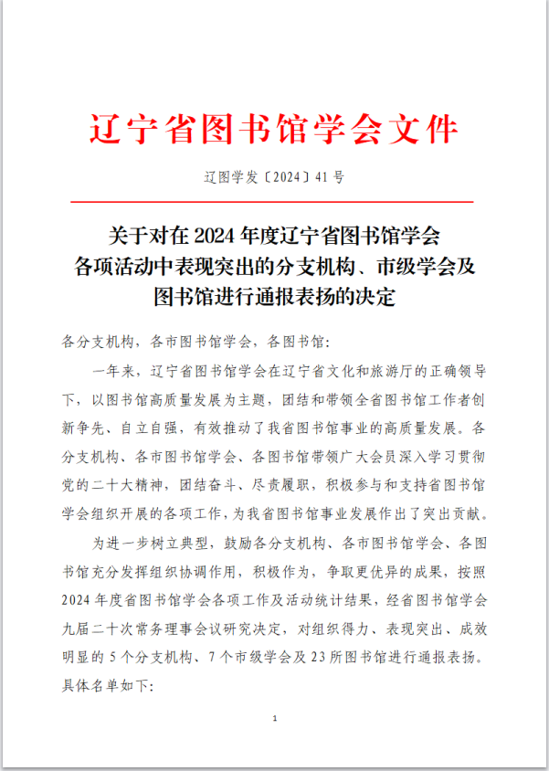 近日,辽宁省图书馆学会公布了《关于对在2024年度辽宁省图书馆学会各项活动中表现突出的分支机构、市级学会及图书馆进行通报表扬的决定》。MK体育在线(中国)唯一官方网站图书馆凭借在2024年度的突出表现和积极贡献,获得通报表扬。