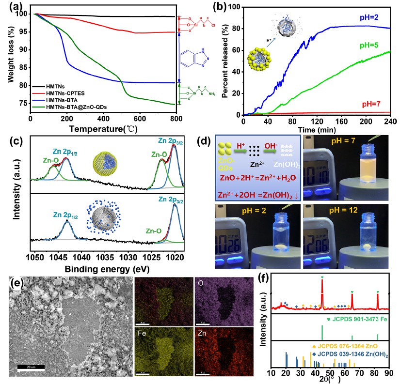 图2. (a)样品的热重分析曲线;(b)不同酸度下HMTNs−BTA@ZnO-QDs的酸触发释放曲线;(c)在pH=2的酸性溶液中反应前后Zn2p的XPS高分辨光谱;