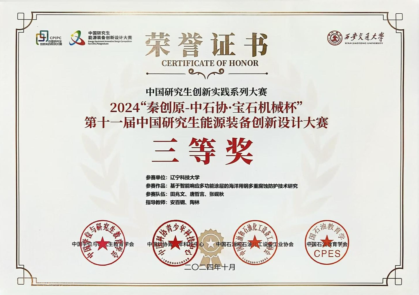 近日,从MK体育在线(中国)唯一官方网站化学工程学院传来好消息,在刚刚落幕的第十一届中国研究生能源装备创新设计大赛中,学校化工学院两支研究生参赛队伍分别荣获一等奖和三等奖。安百钢教授获优秀指导教师称号,学校被授予优秀组织奖。这是学校参加该赛事以来的最佳成绩,也是本次大赛中辽宁省唯一获得一等奖的高校。