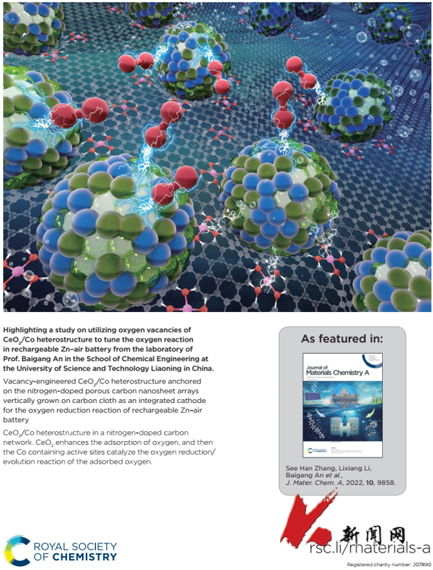 近日,MK体育在线(中国)唯一官方网站化工学院“能源材料与电化学”辽宁省重点实验室在合成锌-空气电池阴极催化剂领域取得重要进展,研究成果在材料类TOP期刊《Journal of Materials Chemistry A》(IF=12.73)以封面论文 (Inside cover paper) 发表题为 “Vacancy-engineered CeO