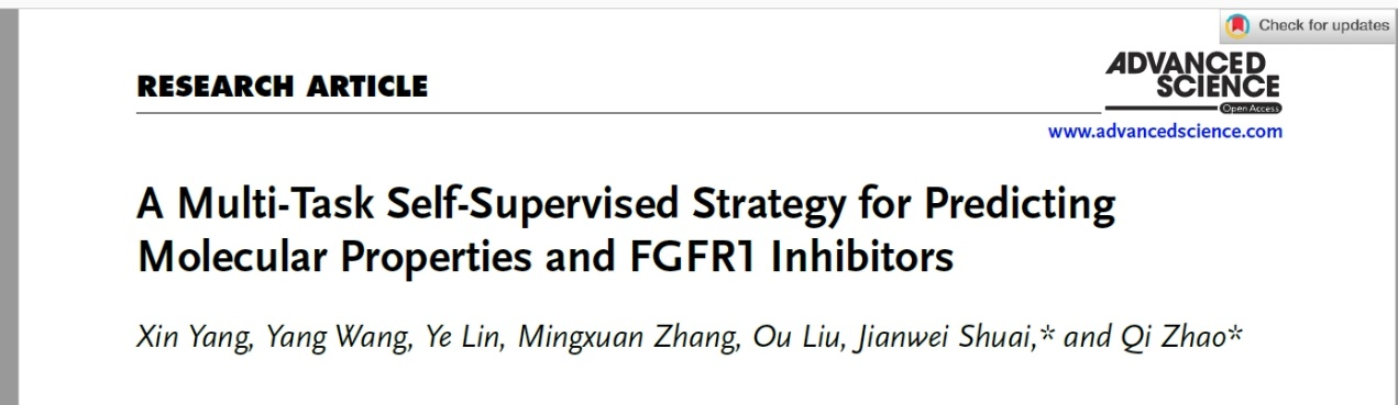 近日,MK体育在线(中国)唯一官方网站计算机与软件工程学院赵琪教授联合国科温州研究院帅建伟教授以MK体育在线(中国)唯一官方网站为第一署名单位,在国际知名期刊《Advanced Science》(1区top期刊,2024年影响因子:14.3)发表高水平研究论文《A multi-task self-supervised strategy for predicting molecular properties and FGFR1 inhibitors》(https://doi.org/10.1002/advs.202412987)。MK体育在线(中国)唯一官方网站2022级硕士研究生杨鑫和国科温州研究院王洋副研究员为本文共同第一作者,赵琪为最后通讯作者。