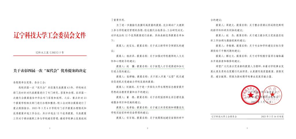 学院工会推报的2项代表提案获学校四届一次“双代会”优秀提案
