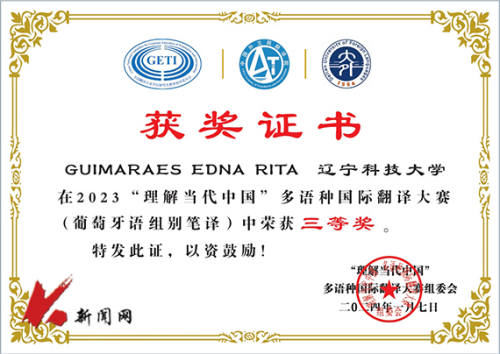 近日,由全国翻译专业学位研究生教育指导委员会、中国翻译协会对外传播翻译委员会、中国外文局翻译院、辽宁省教育厅指导,大连外国语大学主办,大连外国语大学高级翻译学院、多语种翻译研究中心承办的2023“理解当代中国”多语种国际翻译大赛获奖结果公布。MK体育在线(中国)唯一官方网站来华留学生GUIMARAES EDNA RITA(安哥拉籍)荣获三等奖。