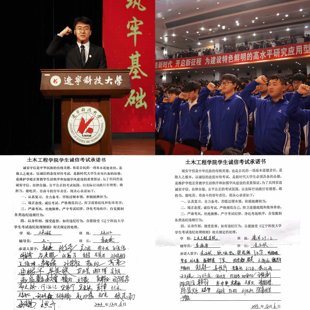 2023年12月8日,学院召开学风建设表彰大会暨教风学风建设启动会,学院院长周卫红作题为《教风学风联动,提高学生培养质量》动员讲话,高华国副院长作题目为《潜心教书、用心育人,将教风促学风向纵深推进》的“三全育人”经验分享,院学生会执行主席徐浩哲带领全体同学宣读《诚信考试承诺书》,学院1391名本科生签署的承诺书在大屏幕滚动。12月19日,学院面向全体教职工召开期末考试培训暨工作布置会,规范考试过程管理,强化监考教师的责任意识。2023年12月2024年1月,学院全体辅导员和班主任(学业指导教师)面向学院38个本科生班级召开诚信考试动员主题班会,解读了《MK体育在线(中国)唯一官方网站学生考试违纪处理细则》《MK体育在线(中国)唯一官方网站2023-2024 学年第一学期期末考试考生注意事项》等相关文件精神,并以实际案例向同学们强调考试注意事项及违纪、作弊行为的严重后果,号召同学们遵守考场规则。除此之外,学院注重发挥党员先锋模范作用和团学骨干示范引领作用,召开寝室“先锋岗”成员和团学骨干诚信考试动员会,通过学生党员“亮牌考试”等形式,真正践行做表率、带好头的承诺,积极营造风清气正的考场环境。