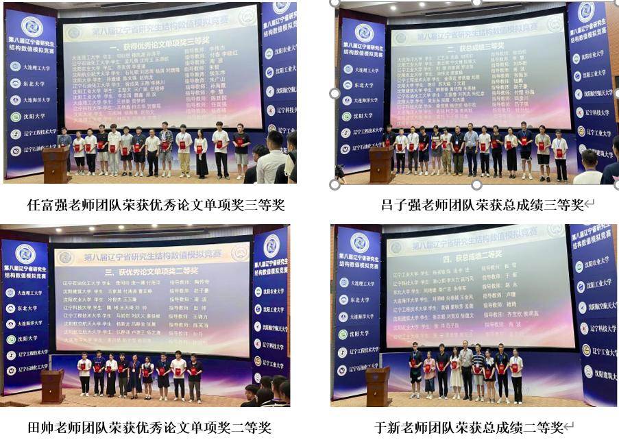 此次竞赛是辽宁省高校土木工程学科重要的研究生赛事之一,有来自东北大学、大连理工大学等12所省内高校土木工程学科的专家评委、参赛指导教师和49支参赛团队参加了竞赛活动。我校土木工程学院于新老师指导的耿心茹、李兴力、苗巧凤团队获得总成绩二等奖;田帅老师指导的隋彬、刘建帅、王天琦团队获得优秀论文单项奖二等奖;吕子强老师指导的秦恒博、杨佳妮、杨宇欣团队获得总成绩三等奖;任富强老师指导的王林鑫、田志华、贺馨瑶团队获得优秀论文单项奖三等奖。MK体育在线(中国)唯一官方网站获得优秀组织单位称号。