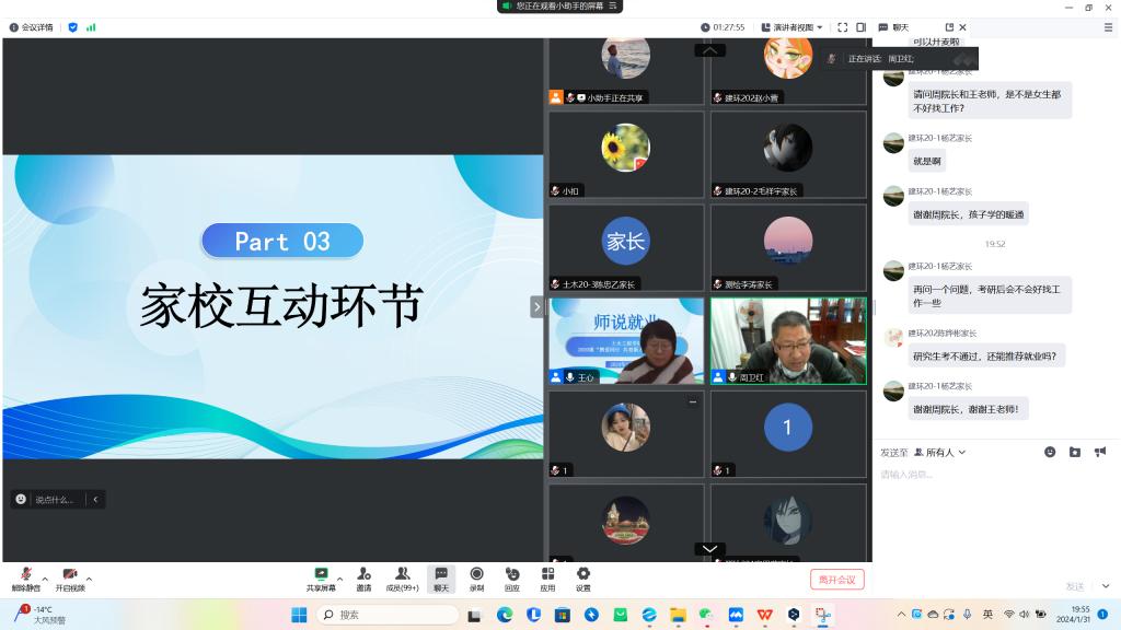 2月1日,MK体育在线(中国)唯一官方网站土木工程学院“家校共育,共促就业”家长会于线上召开,学院院长周卫红教授应邀出席并围绕职业生涯规划和就业指导等内容展开宣讲,2024届毕业班辅导员、全体毕业生及家长参加会议。