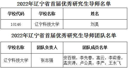 2022年12月26日,辽宁省教育厅公布了《关于首届优秀研究生导师、优秀研究生导师团队评选结果的公示》,我校刘昊老师获评2022年辽宁省首届优秀研究生导师,张志强团队获评2022年辽宁省首届优秀研究生导师团队。