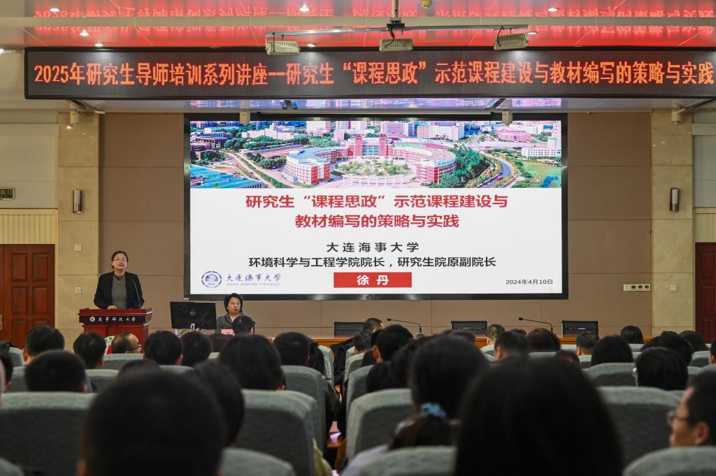 为深入贯彻立德树人根本任务,以"导师能力提升"与"课程思政创新"为双轮驱动,4月10日下午,研究生院在图书馆报告厅启动2025年研究生导师系列培训活动。首次培训特邀大连海事大学环境科学与工程学院院长徐丹教授作了题为“研究生‘课程思政’示范课程建设与教材编写的策略与实践”专题报告。各培养学院研究生教学院长、导师代表、研究生授课教师等人员聆听讲座,研究生院相关同志参会。
